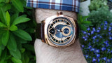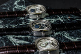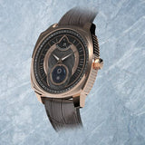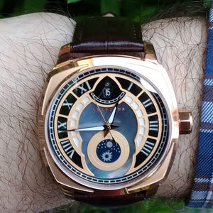 This variant of the Arcturus LC-1 limited edition dress watch comes in a rose gold colored case with black accents, a real mother-of-pearl dial, and 24 hour sub-dial with a sun and moon wheel. A lacquered wooden presentation box is also included.