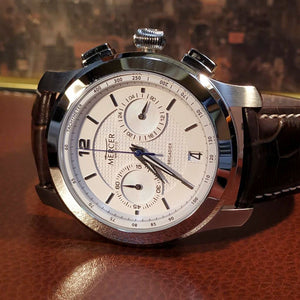 Based on the strong styling with it's unique Mercer flair, and the fact that this is a chronograph, we feel this offers excellent value for money when retailed at less than $300 USD. The watch is powered by a Seiko VK mecha-quartz movement which gives you the best of both the mechanical and battery-driven worlds. You get the better accuracy, convenience and pricing of a quartz movement, but the chronograph second hand still sweeps like a mechanical timepiece at 5 ticks per second instead of the usual quartz 1 tick per second, and the chronograph reset is mechanical and instantaneous, giving the pushers a mechanical feel.