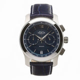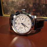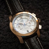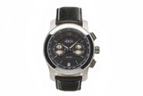 This is a very stylish chronograph that can double as a modern dress watch, with a lot of refined features from the guilloché patterning on the face, to the contrasting sunburst sub-dials with their concentric snail circles, to the strongly accented bezel, to the onion crown with a star monogram, denoting the one star rank insignia of a brigadier general. It comes with a very dressy crocodile-grained leather strap which adds to the refined look of this timepiece.